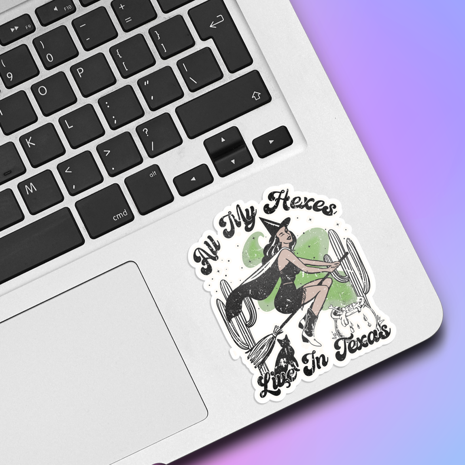 The perfect Halloween sticker for those classic country music fans! Featuring a spooky witch on a broomstick and the phrase "All My Hexes Live in Texas." This sticker is perfect for sticking pretty much anywhere.. from laptops, to water bottles, planners and more!